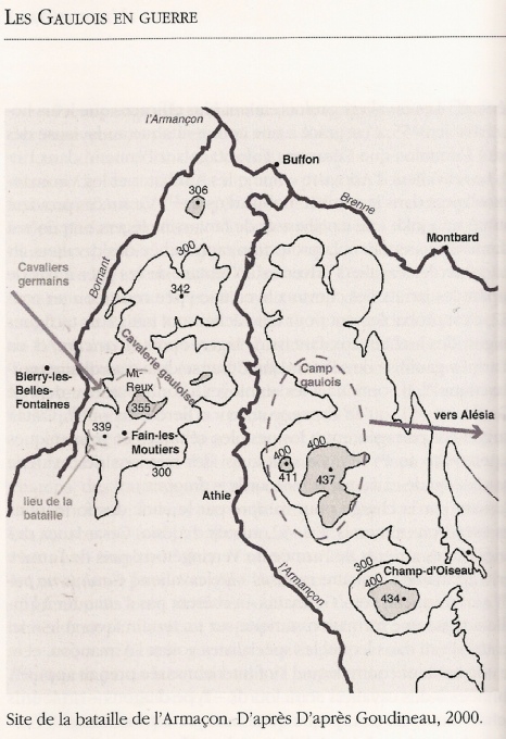 Car près de Montbard, les Romains sont supposés suivre l’Armançon entre Buffon et Athie par une vallée encaissée entre des collines qui la domine d’une centaine de mètres. Le lieu serait propice à une embuscade, à condition que celle-ci ne repose pas entièrement sur une énorme cavalerie (15 000 hommes) qui ne peut pas se déployer utilement dans cette vallée.