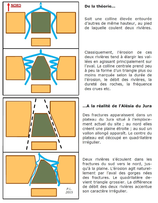 En effet, dans une vallée par définition étroite puisque « glissée entre des collines », deux rivières d’une certaine importance ne peuvent rester indéfiniment parallèles et sont forcément amenées à se réunir. Leur rencontre forme ainsi un triangle plus ou moins ouvert. Or l’érosion fluviale est régressive, terme signifiant qu’elle se fait de l’aval vers l’amont et non dans le sens du courant. L’érosion agit ainsi prioritairement dans la zone la plus basse de chacune des deux vallées et sur leurs quatre flancs : le bas (l’aval) des deux vallées s’élargit, leurs bords intérieurs se rapprochent et le relief qui les sépare (ici l’oppidum) se réduit et prend peu à peu une forme triangulaire plus ou moins marquée.