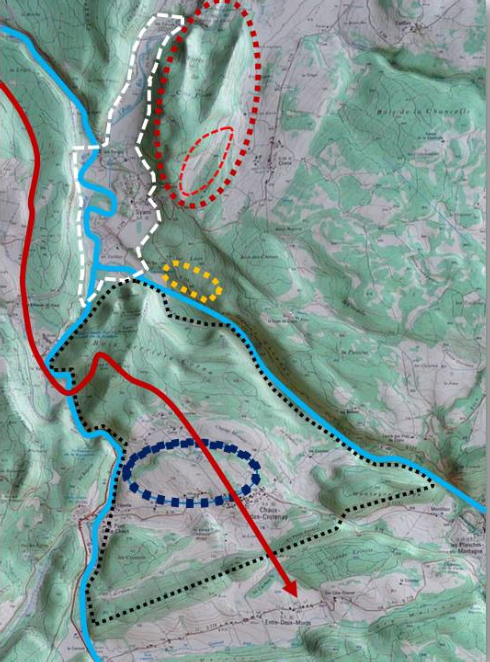 La seule route (flèche rouge) traverse l’oppidum naturellement fortifié (pointillé noir).
