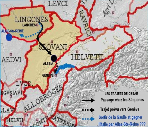 Avant toute chose, il faut regarder la carte. César est dans la région de Langres, capitale des Lingons. Il veut secourir les Allobroges, capitale Genève. Leur territoire fait partie de la Province, cette partie de la Gaule déjà romanisée. Arrivée là, l’armée romaine sera à l’abri. Que fait-